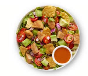 Salads Crispy Chicken Poblano 1299 420 CAL 164 kg CO2e Extra Crisp Romaine Shredded Kale Oven Crispy Chicken Grated Cotija Hass Avocado Roasted Corn Overnight Pickled.